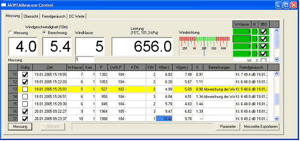 angezeigt. Der Benutzer kann an dieser Stelle wählen ob die Windgeschwindigkeit aus der Leistung berechnet oder mit dem Anemometer gemessen werden soll. Die Einstellung gilt für die gesamte Messreihe, bei evt. vorhandenen Messungen kann sich die Zugehörigkeit zu einer Windklasse ändern. Oben rechts wird die Anzahl der Messungen pro Windklasse angezeigt. Bei Erreichen der erforderlichen Anzahl wird die Windklasse grün hinterlegt.